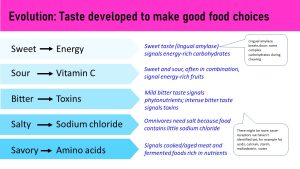 - If something tasted sweet it would point to energy-rich carbohydrates and indicated a good food choice. Even better if the food combined sweet and sour because this would point towards energy rich fruits.