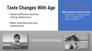 While infants are born with specific taste preferences this pattern will not remain lifelong. The preference for sweet will decline during adolescence and bitter taste will become less pronounced.