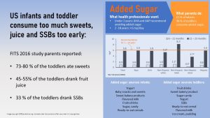 Another study gives us additional insights. This study looked specifically at added sugar intake and found that 60 % of the infants and almost all toddlers consume foods with added sugar. The top sugary foods for infants are baby snacks and sweets, bakery products, and flavored milk. For toddlers the top three are fruit drinks, bakery products, and sweets.