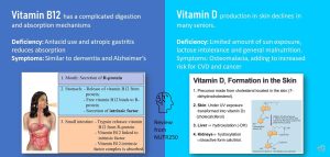 Vitamin B12 is another nutrient of concern. Around 20% of seniors have mild vitamin B12 deficiency that results in neurological similar to early dementia symptoms such as memory loss, lack of physical coordination, vision problems, and difficulty speaking. Easily, the diagnosis is rather dementia and not vitamin B12 deficiency because only severe vitamin B12 deficiency will produce pernicious anemia which is easier to diagnose.