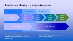 - At 6 month complimentary foods become necessary to supplement breastmilk or formula.